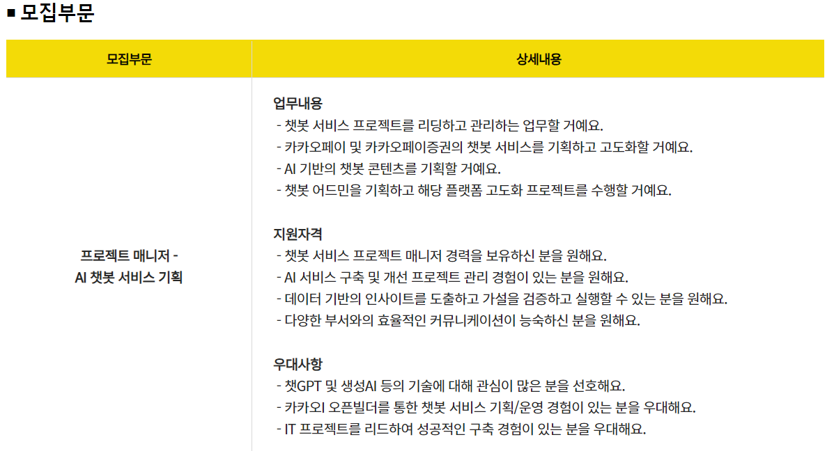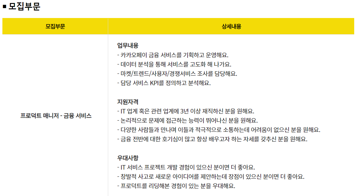 또 다른 핀테크 기업인 카카오페이에서는 '프로젝트 매니저'와 '프로덕트 매니저'가 존재하는것을 확인할 수 있었다.